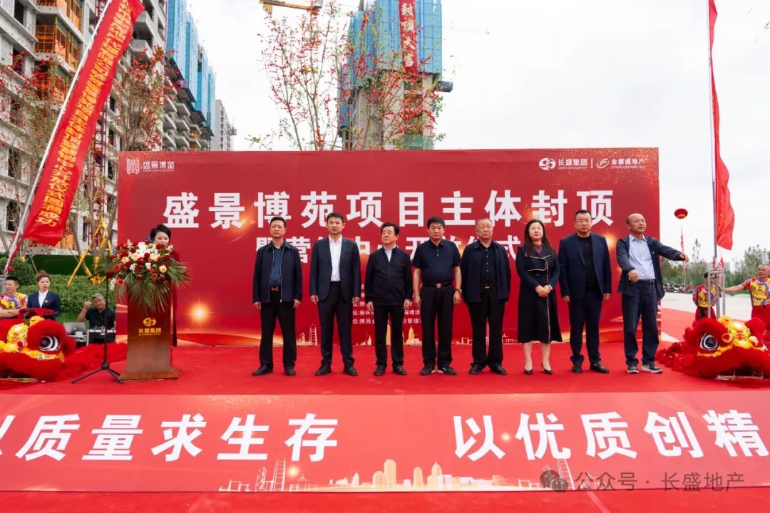 9月13日,盛景博苑項目在施工現場舉行主體結構封頂儀式。陜西長盛實業集團有限公司董事長徐團林,董事長助理黨世明,副總經理黃建梅、徐遼飛;榆林金都盛房地產開發有限公司董事長王忠義,總經理王廣飛;榆林市成建路橋工程建設有限公司總經理呂成雙;榆林市長盛集團房地產開發有限公司副總經理劉世斌及各參建單位代表、受邀嘉賓等出席封頂儀式,共同見證這一重要時刻。