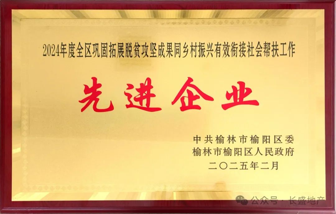 近日,中共榆陽區委農村工作會議成功召開。會上,榆林市長盛集團房地產開發有限公司被中共榆林市榆陽區委和榆林市榆陽區人民政府授予“2024年度榆陽區鞏固拓展脫貧攻堅成果同鄉村振興有效銜接社會幫扶工作先進企業”榮譽稱號。