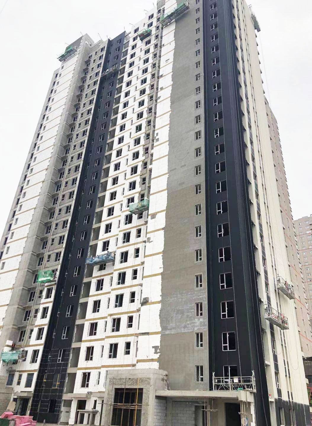 1#樓:外墻保溫與真石漆施工完成30%。
