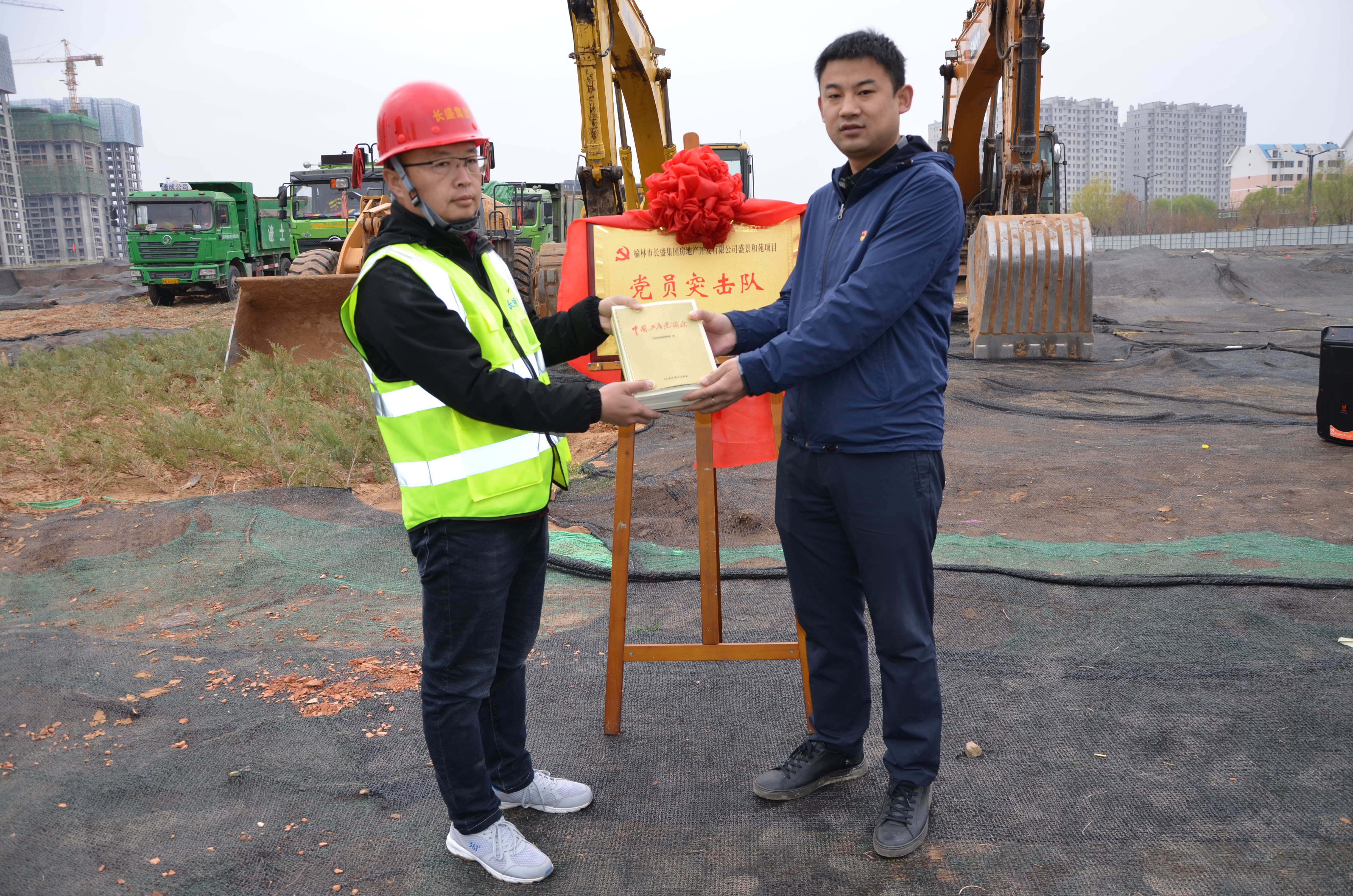 隨后,徐遼飛為黨員突擊隊揭牌,楊斌為黨員突擊隊授旗。項目黨員突擊隊全體隊員面對黨旗,莊嚴宣誓。