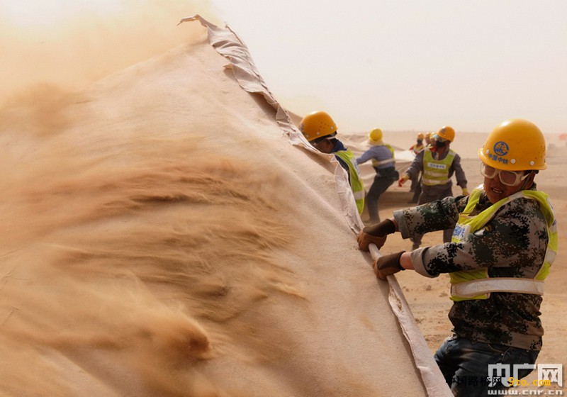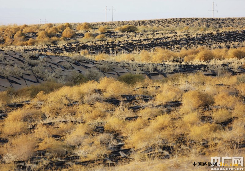 沙漠龍:在巴丹吉林沙漠,沙土每年平均移動速度大約有18米,如果不固定住移動沙丘,流沙很容易覆蓋公路。固沙關鍵是一個個2米長、20公分寬的填充式黑色沙袋。這些沙袋呈田字形交叉疊放,然后形成一個個1平方米的小方格,連成一片。沙袋在設計很特別,是有鰭沙袋,編織袋邊沿會留出3公分的穗兒,別小看這些穗,不單能減小風速,還能把吹起來的沙留在框格內。沙袋的面料采用的是耐寒耐曬材質,至少可以保持20年。第一項目部工程師王大偉說,根據風向,不同路段、不同方向鋪設的沙袋群,寬度都有精確計算。